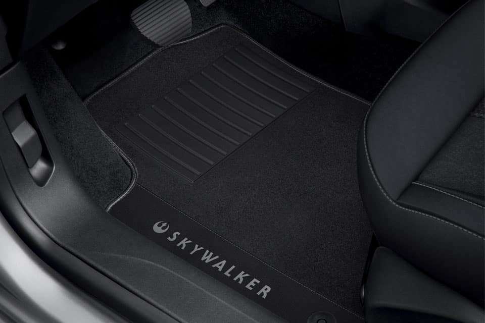 Há sinais do tratamento Skywalker também na cabine. Os quatro tapetes da “nave” recebem piloto e passageiros de maneira exclusiva: têm bordas com costura branca e aplicação do logo da Aliança Rebelde e assinatura estilizada Skywalker. Para plena segurança, o tapete do motorista conta com sistema de travamento compatível com as travas originais instaladas no carpete do carro.