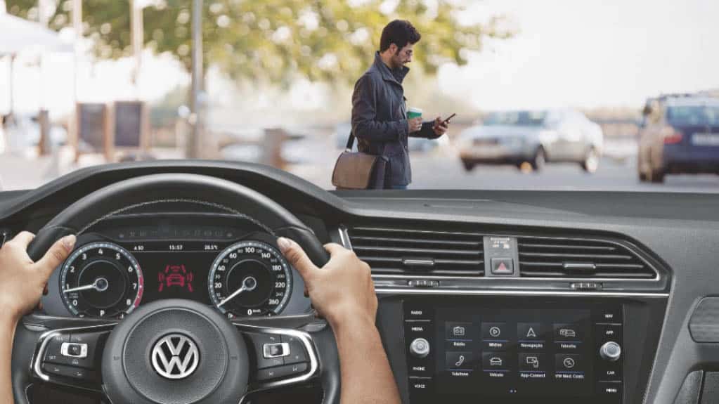 O sistema de frenagem autônoma do Tiguan Allspace também é capaz de identificar pedestres cruzando à frente do carro: quando é detectado risco de acidente com um pedestre, o sistema alerta o motorista e, caso necessário, inicia a frenagem automaticamente para evitar ou minimizar uma colisão.