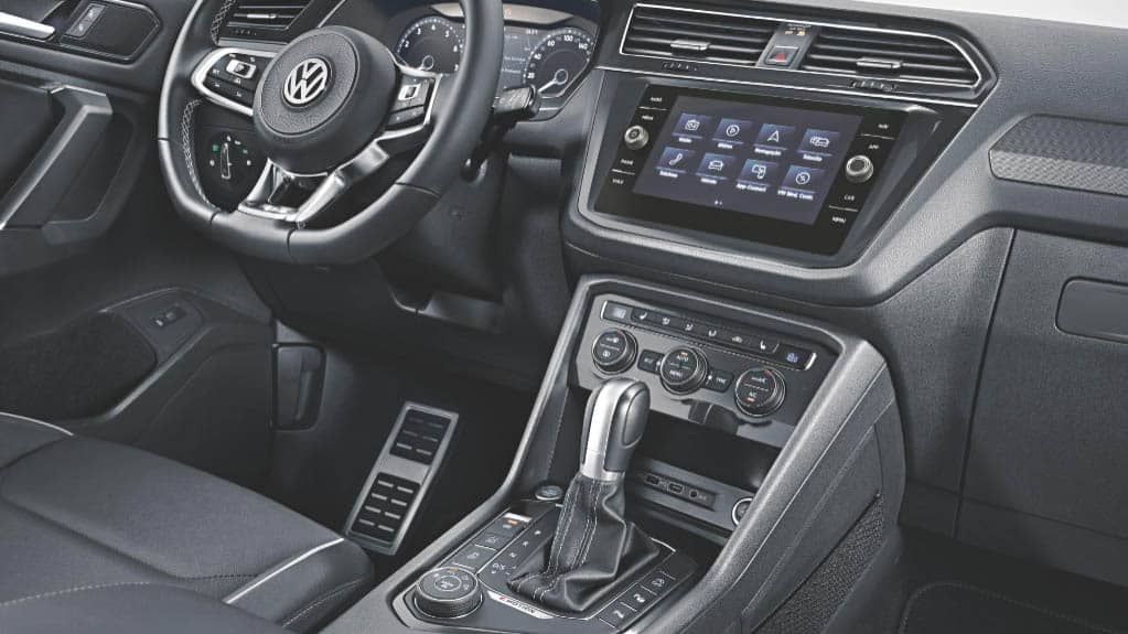 O acabamento interior do Tiguan Allspace R-Line 350 TSI é predominantemente preto. O volante multifuncional tem design exclusivo (com a base reta, revestimento em couro perfurado e logo R-Line). Os bancos têm cobertura em couro Vienna preto e logotipos alusivos à versão.